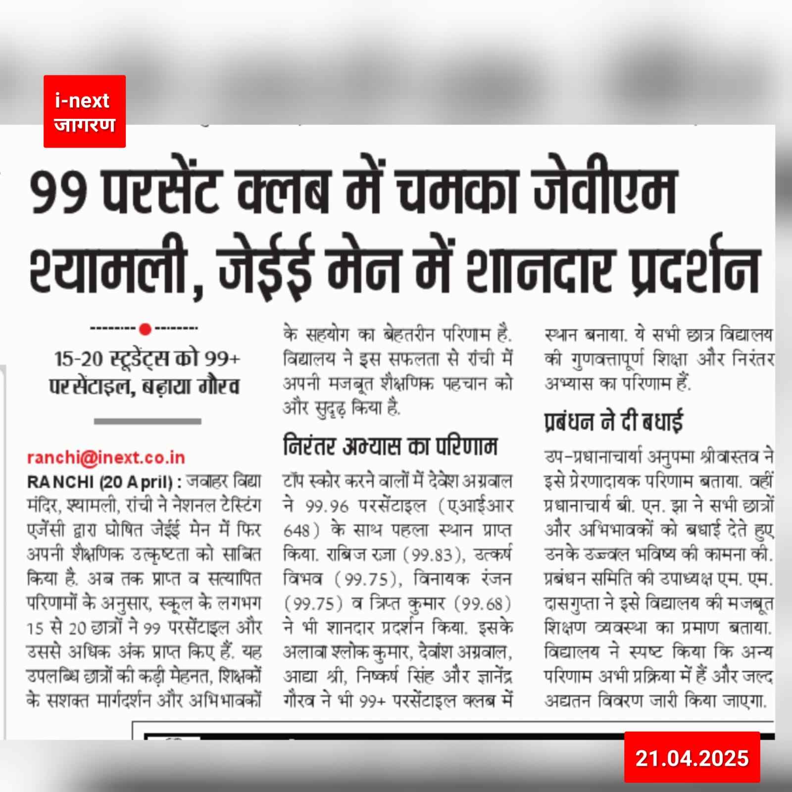 Jawahar Vidya Mandir is a co-education English Medium School situated in the sylvan and serene surroundings of Shyamali Colony of MECON.