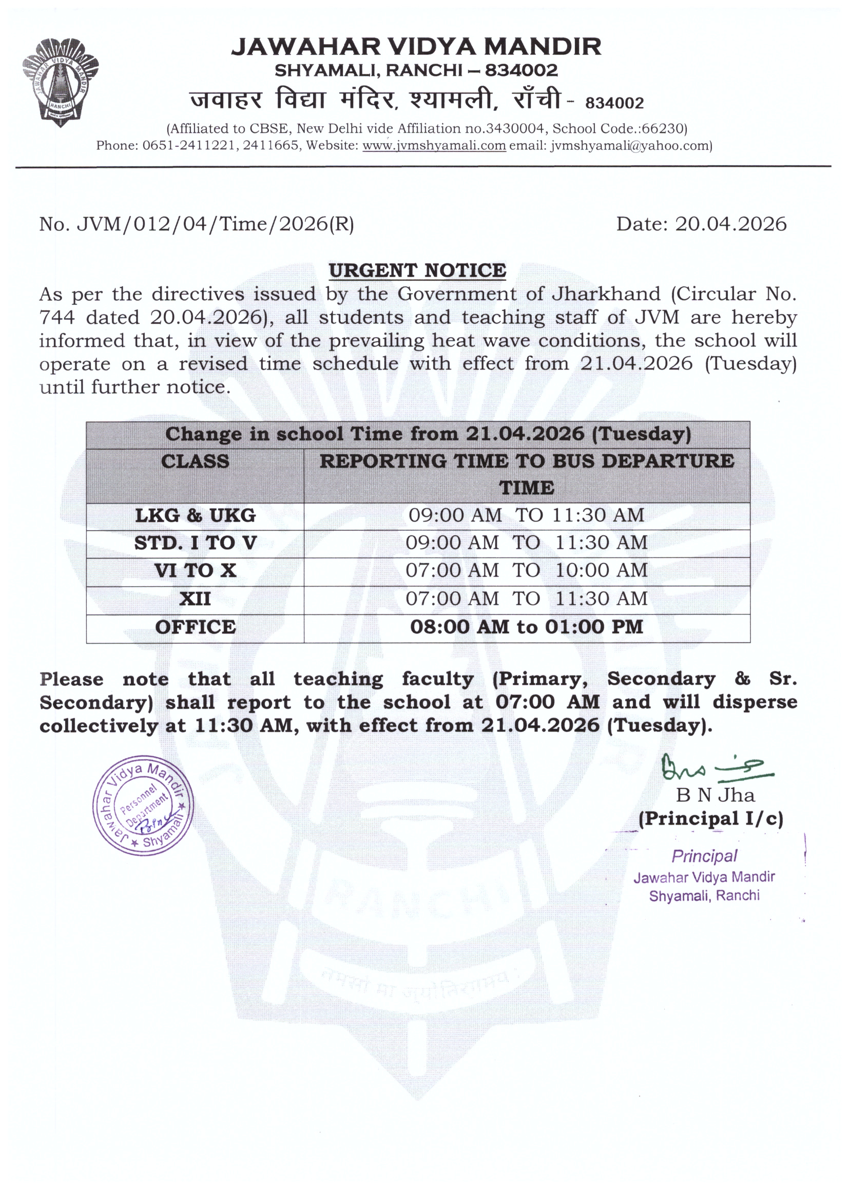 The School imparts education from the Nursery to the Senior Secondary Level. It is permanently affiliated to the Central Board of Secondary Education, New Delhi and is managed by Jawahar Vidya Mandir Education Society, Ranchi.